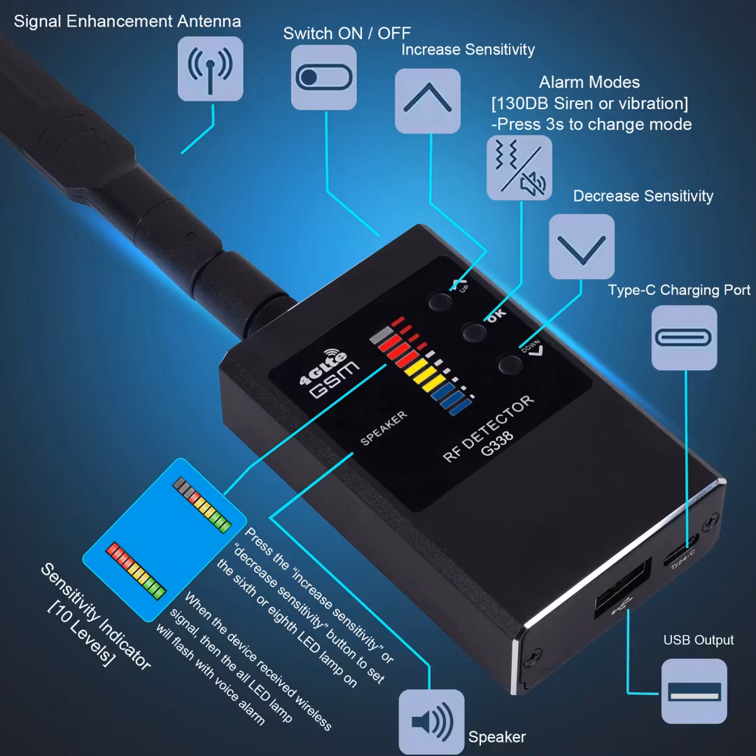 Skydda din integritet effektivt: Upptäcker professionellt och exakt positionen för dolda WiFi-kameror, ljudfel och GPS-spårningsenheter inom några minuter genom RF-detektering. Den kan effektivt förhindra avlyssning, osynliga foton och läckage av personlig integritet. Observera att den inte ska användas på platser med många människor och buller.