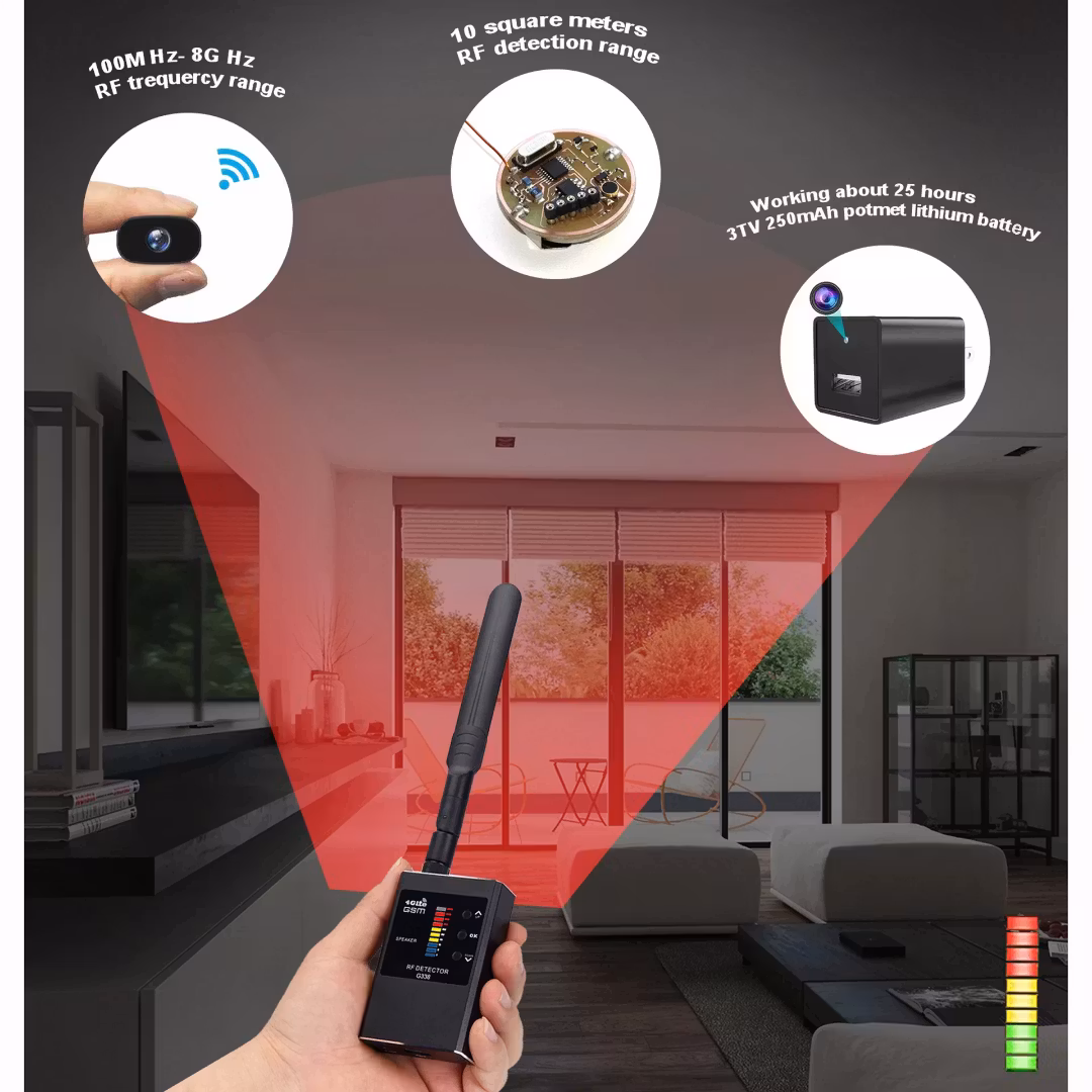 Brett användningsområde: Kontrollera breda scenarier, som hotell, badrum, omklädningsrum, myndigheter, affärsförhandlingar, skolvakter, nöjesplatser, verkstäder, militära industrianläggningar etc. Var och när du inte litar på omgivningen kan detektorn hjälpa dig att känna dig trygg. Det är en hjärtevärmande present till affärsmän, politiker, flickvänner, älskare, universitetsstudenter, barn och flickor.