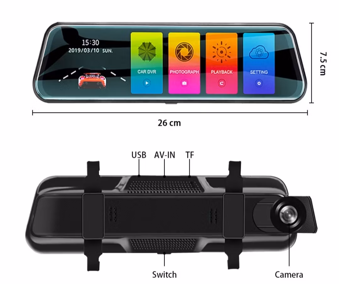 Senaste bil spegel med inbyggd dual kamera.Den har både framkamera , backkamera och dvr för direkt inspelning.