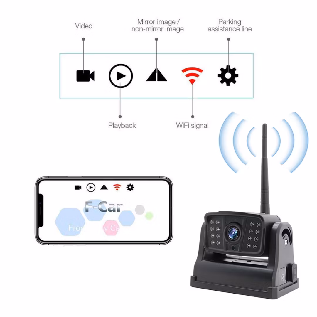 WiFi-backkamera med magnetisk dragkrok levereras med 'RV Kamera-app för mobilen. Använd din iPhone, iPad, Android, mobiltelefon, smartphone eller surfplatta för att ansluta till Wi-Fi. Du kan se vad som händer bakom ditt fordon i appen. Ingen skärm på instrumentbrädan längre.