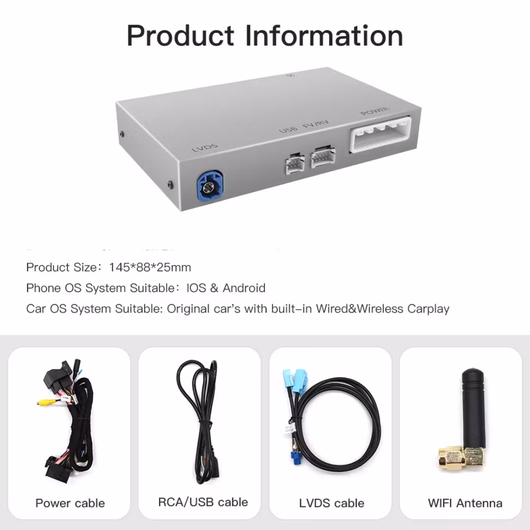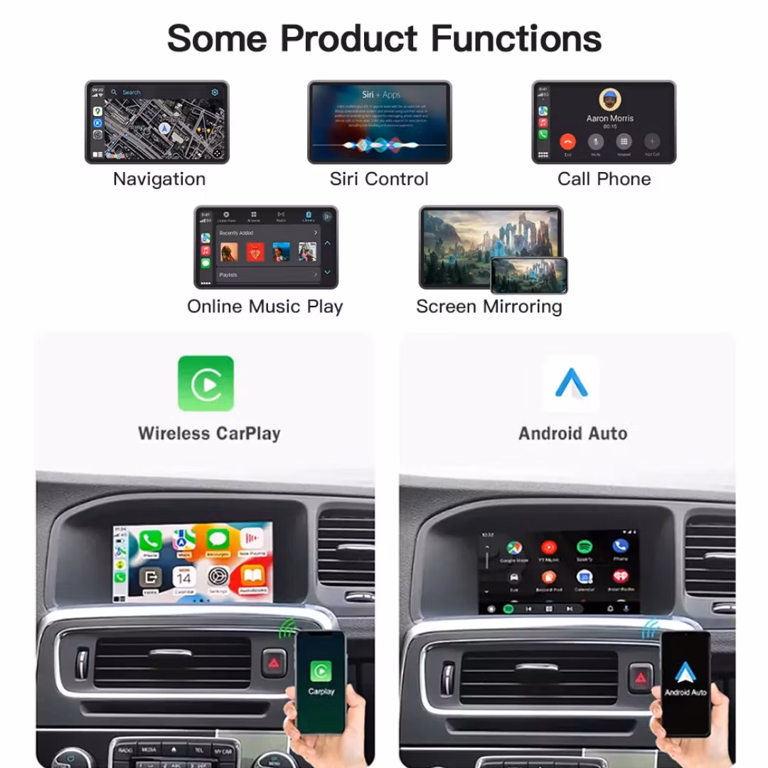 Detta är ett tillbehör från tredje part. Den trådlösa adapterboxen lägger till CarPlay- och Android Auto-funktionalitet till din befintliga huvudenhet samtidigt som alla originalfunktioner från bilen behålls.
