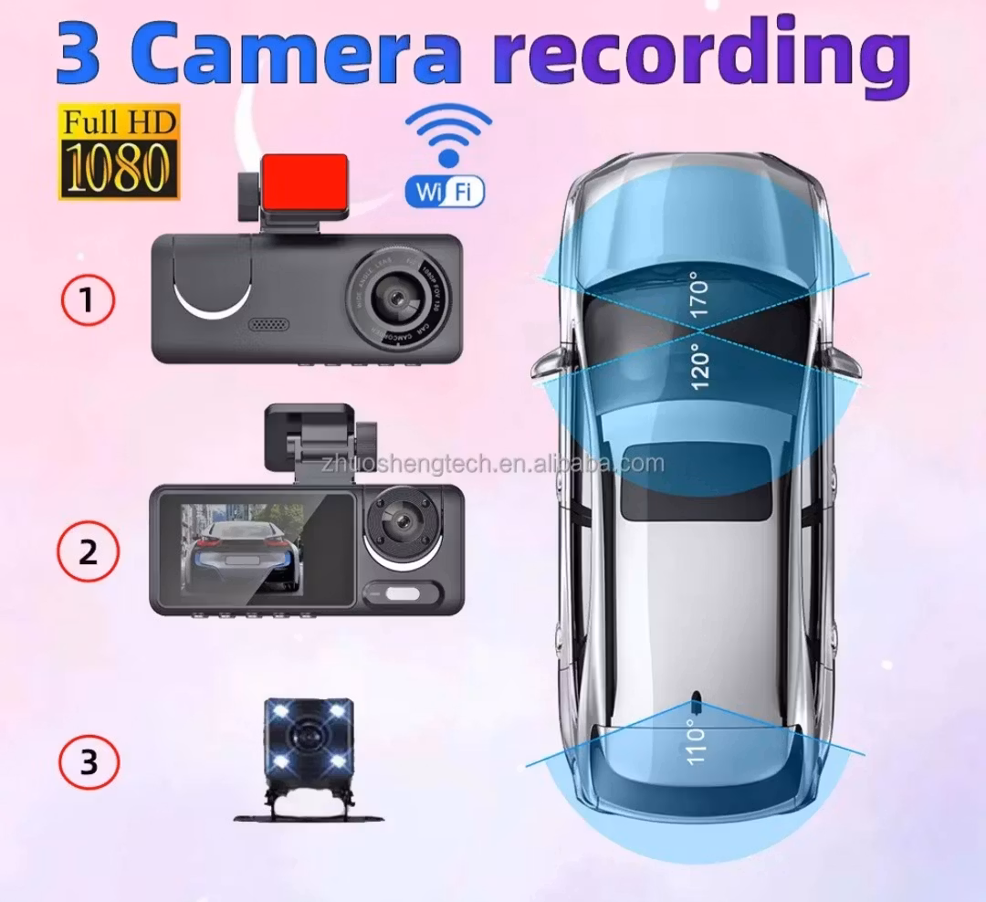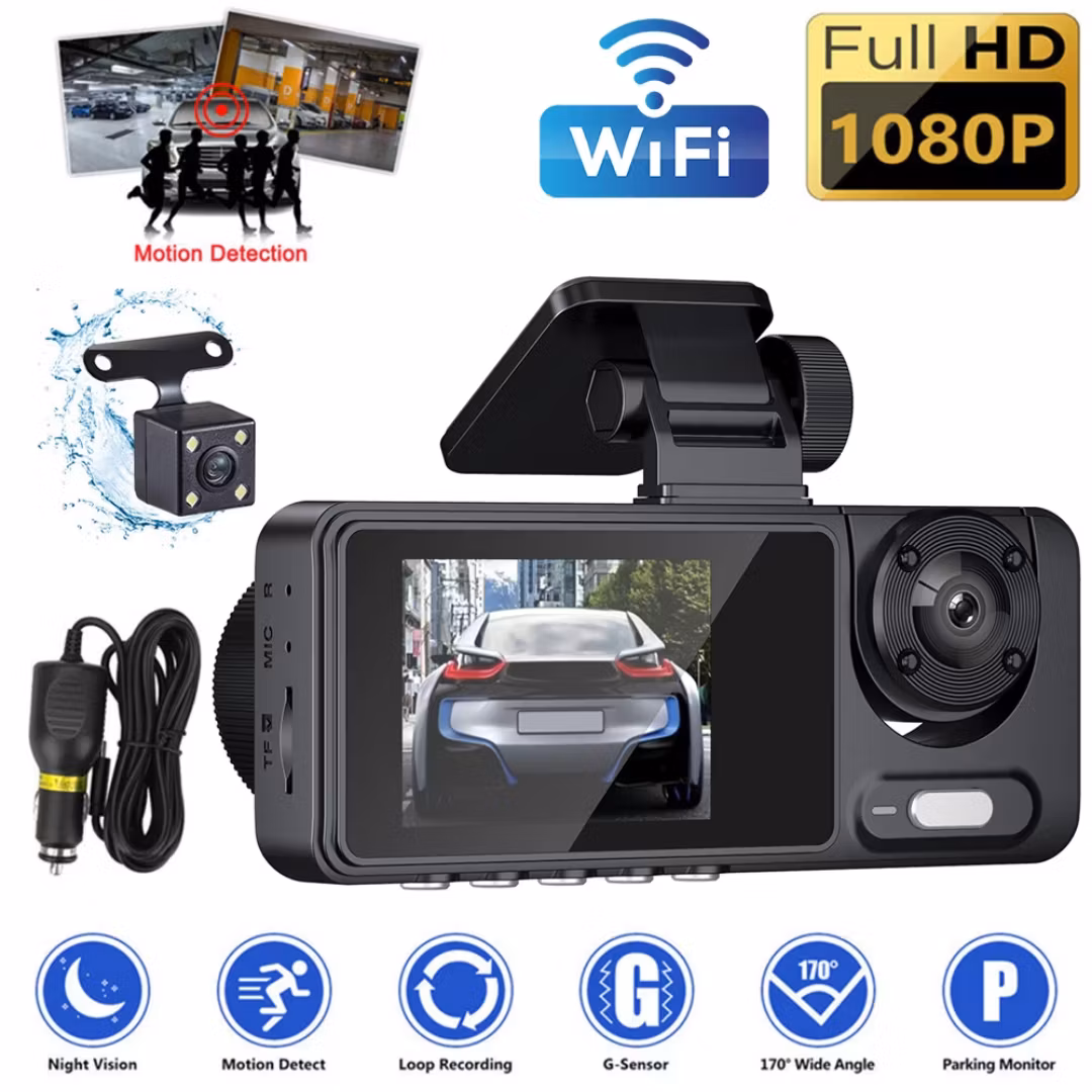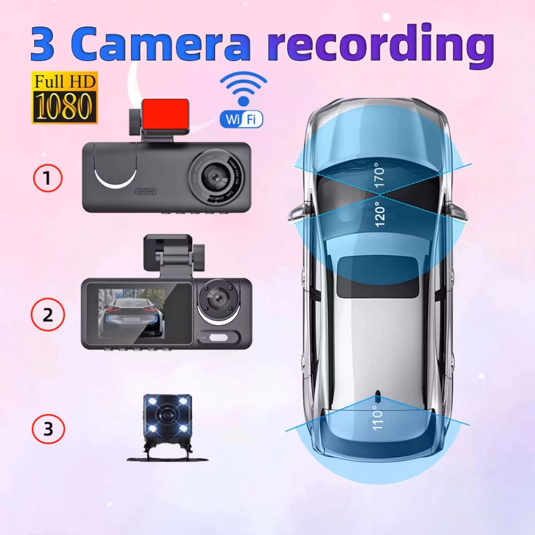 1. Trippellins-bilkamera: Bilkameran har tre linser som ger 1080P full HD-inspelning med en 140° vidvinkelvy. Den täcker alla fyra körfält och garanterar din säkerhet på vägen. Den kraftfulla mörkerseendefunktionen med en F/2.0-bländare ger utmärkt bildkvalitet, både dag och natt.