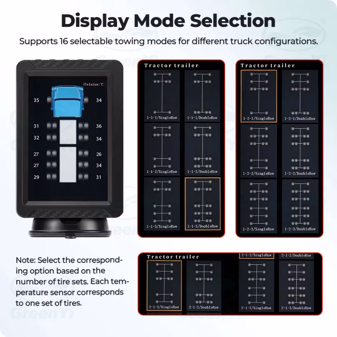 * Larmläge: Det finns två steg. Det första steget: När ett hjul når eller överstiger varningstemperaturen på 85°C blir den inbyggda displayskärmen röd och motsvarande hjulikon blir röd. En summer ljuder, med en larmperiod på 2 sekunder följt av 2 sekunders paus, för totalt 10 larm. Det andra steget: När temperaturen når 110 °C fortsätter larmet. Skärmkanten blir röd och motsvarande hjulikon blir röd. Summern fortsätter att ljuda tills hjultemperaturen återgår till ett säkert område.